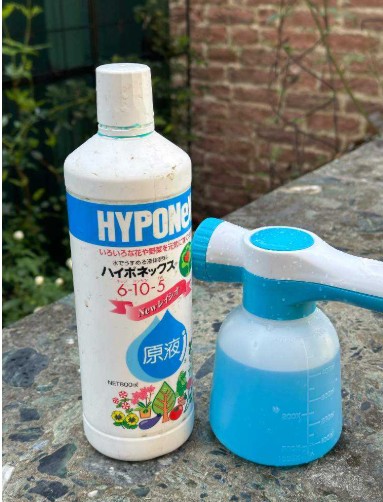 ハイポネックスを1000倍に薄めて植物の根元に。 水圧で一定の薄さを保てるホース使用。